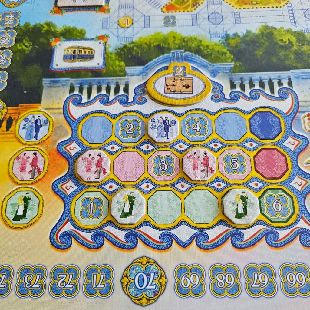 Stap 3: Elke keer dat een Gebouw wordt geplaatst, worden er Inwoners op het Inwonerspoor gelegd. Hierdoor vult het Inwonerspoor zich geleidelijk gedurende het hele spel. Na elke bouwfase moet er gekeken worden of er een Cerda-scoring is getriggerd. Dit gebeurt wanneer één rij (groen, roze of blauw) de laatste positie van het blok heeft bereikt. Er volgt dan een scoring op basis van de Cerda-tegel die boven het blok ligt. Deze tegel geeft een doel en een aantal punten. Dit vermenigvuldig je met het aantal dat je op het Cerda-spoor omhoog bent geklommen (1-4x). Deze punten kunnen behoorlijk hoog oplopen, vooral wanneer je ze met 4 mag vermenigvuldigen. Dit is dus een goede reden om ook op het Cerda-spoor flink omhoog te klimmen.