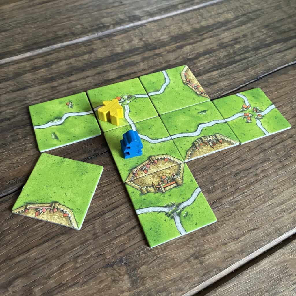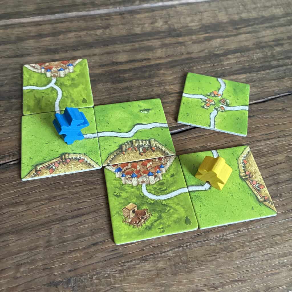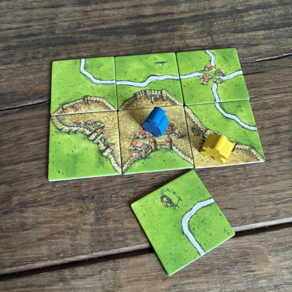 De 4e tegel wordt aangelegd en de stad is nog niet afgebouwd, blauw mag de gele meeple door een blauwe meeple en zijn burgemeester terugnemen