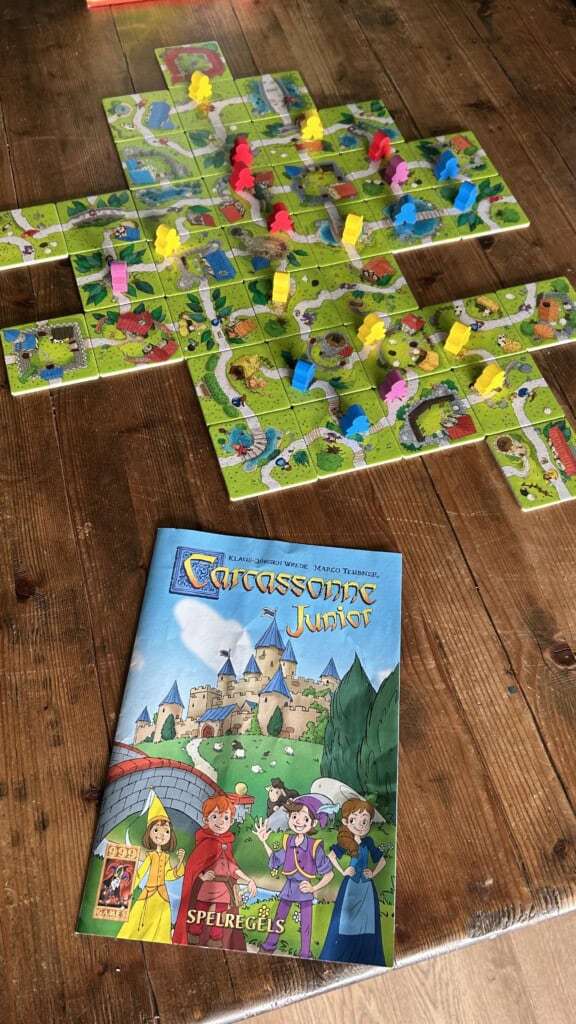 De vormgeving door Marco Teubner is nóg kleurrijker en kinderlijker dan we gewend zijn van de Carcassonne spellen. Inmiddels hebben we best wat bordspellen voor de kinderen, maar Carcassonne – Junior verschijnt momenteel verreweg het meest op tafel!