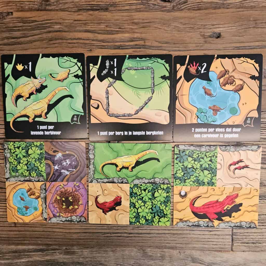 Zoveel mogelijk punten scoren. Ok, das flauw, want dat doe je in zo’n beetje elk spel. Dus hoe werkt Chomp? In 8 beurten verzamel je doel- en landkaarten. De landkaarten probeer je zo slim mogelijk voor jezelf neer te leggen, waarbij je je dino’s wilt voeden en er zoveel mogelijk in leven wilt houden. Uiteindelijk leveren dino’s punten op en hoe groter de dino des te meer punten hij waard is. Maaaaarrrr… De doelkaarten zouden je weleens punten kunnen opleveren voor uitgestorven dino’s, bepaalde combinaties of nesten met eieren. Alle dino’s in leven houden is dus niet automatisch slim. Combineer je doelen en je landkaarten dus zo slim mogelijk, scoor punten en win Chomp.
