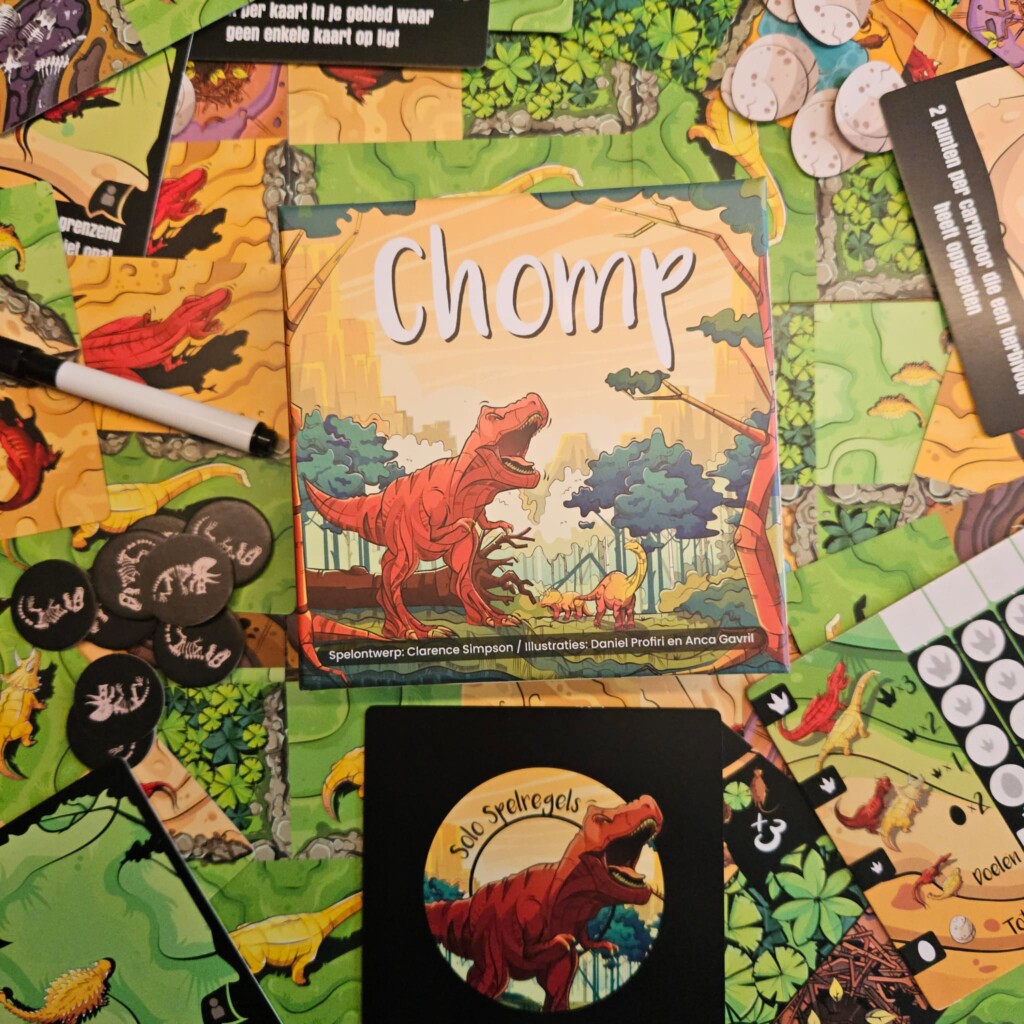 Chomp is een spel van Clarence Simpson met illustraties van Daniel Profiri en Anca Gavril. Het wordt uitgegeven door Time Fades Away. Je kan dit spelen met 1-4 spelers vanaf 8 jaar. Er staat 20-30 minuten voor, al denk ik dat wij in 10 min al klaar waren.