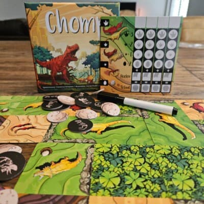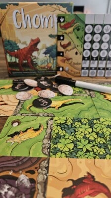 Chomp is echt een snel en eenvoudig spel. Althans qua regels. Want je moet nog goed opletten om goede kuddes te maken, ze te voeden en je doelen te behalen. Daarbij heb je de keuze of je een doel- of landkaart pakt. Maar kies je voor een doelkaart, dan heb je dus automatisch een landkaart met dino’s en voeding minder. Of dit de moeite waard is, is een afweging die je elke beurt weer voor jezelf moet maken.