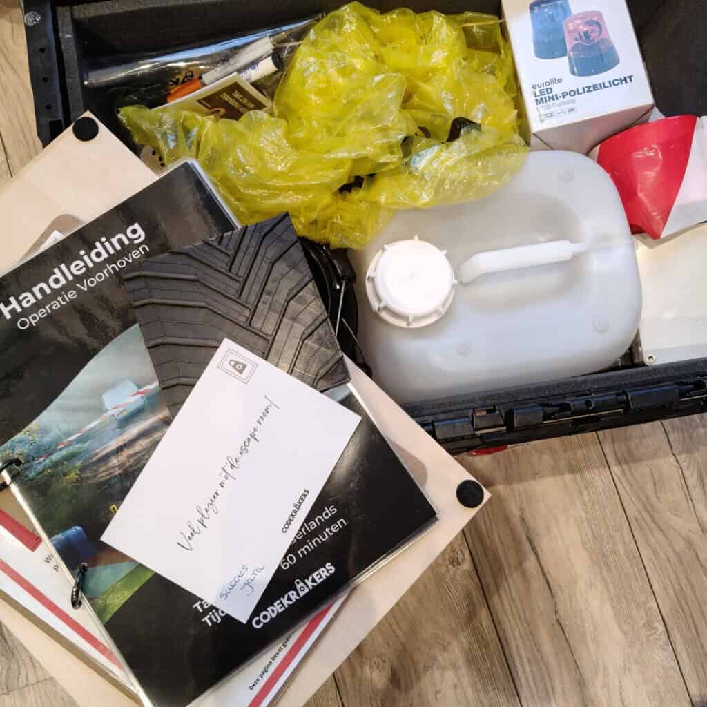 De meegeleverde box bevatte meer materialen dan we in eerste instantie hadden bedacht, waardoor we positief verrast waren. Een aantal voorwerpen zijn bedoeld om echt in de sfeer te komen, zoals afzetlint en een politiezwaailicht. Je kunt de ruimte dus echt omtoveren tot escape room.
