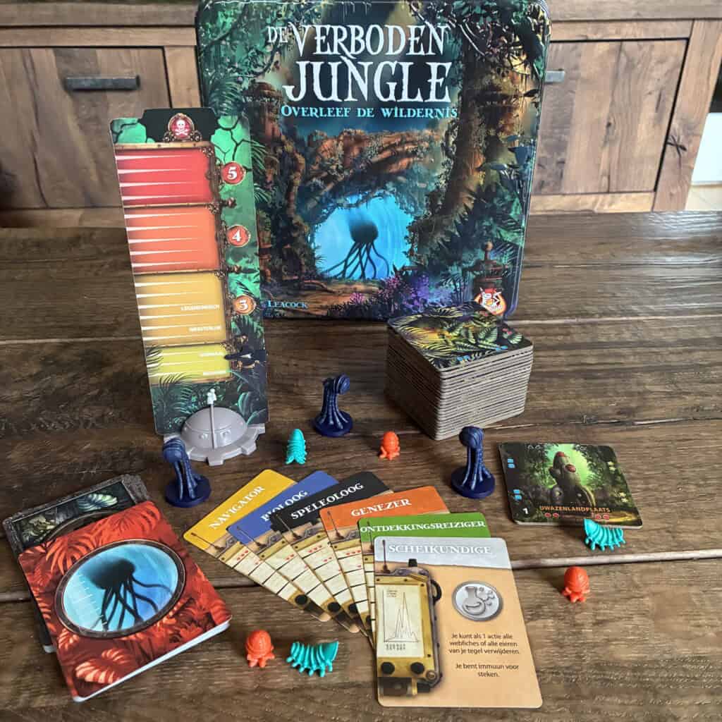 Verboden jungle is uitgegeven door White Goblin Games en maakt deel uit van een serie op zichzelf staande coƶperatieve spellen. In de basis zijn ze aardig gelijk, maar elk spel heeft zijn eigen unieke extra spelelementen en eigen verhaallijn waar je helemaal in op gaat, precies wat een coƶperatief spel naar ons idee moet hebben. Het spel is voor 2-5 personen van 10 jaar en ouder en duurt ongeveer 45 minuten. Het is zeker geen spel voor kleine kinderen maar omdat het coƶperatief is kunnen kinderen al snel meedoen als ze een beetje geholpen worden.