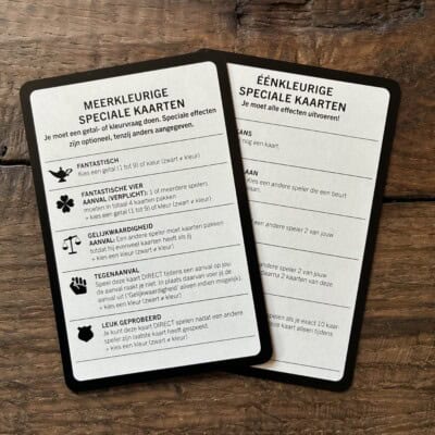 De speciale kaarten zorgen voor verrassende acties. Het leuke eraan is dat je bij de meeste kaarten zelf een slachtoffer mag aanwijzen en dit dus niet automatisch de persoon is die na jou komt. Daarnaast is er nog 1 speciale kaart waar je heel snel vanaf wilt. Niet alleen door het plaatje en de tekst maar ook omdat deze 42 punten telt op het moment dat je hem in je hand hebt terwijl een ronde eindigt. Deze kaart mag je alleen neerleggen op het moment dat je exact 10 kaarten in je hand hebt of je kunt hem kwijt raken bij een gebeurtenissen.
