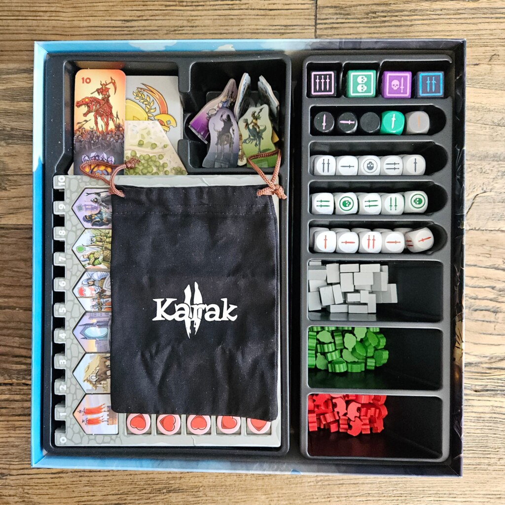 Karak II is één en al avontuur en is een spel dat je snel op tafel legt. Vanwege het eenvoudige spelmechanisme en weinig keuzestress is het spel geschikt voor jong en oud. Een klassiek fantasieverhaal vol helden, monsters en magische voorwerpen is altijd leuk. In Karak II krijgen oude en nieuwe helden te maken met duistere vijanden. Naast hun eigen vaardigheden kunnen de helden beschikken over de vaardigheden van hun unieke rijdier (leuke tekenstijl!). Je bouwt je eigen stad, ontdekt de omgeving van Karak en neemt het op tegen unieke monsters. Welke monsters wanneer ten tonele verschijnen is pure willekeur. Het dobbelen geeft iedere worp weer andere uitslagen, waardoor het ook met de herspeelbaarheid wel goed zit.