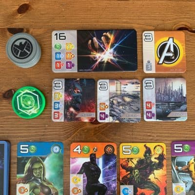 Nieuw is ook dat er op sommige kaarten een Avengers symbool staat. De eerste speler die 3 van deze symbolen heeft verzameld, ontvangt de ‘Avengers Assemble Tile’ en die is 3 overwinningspunten waard. Maar let op, want zodra een medespeler meer Avenger symbolen heeft dan jij pakt hij deze ‘Tile’ van je af en ben je 3 punten armer.