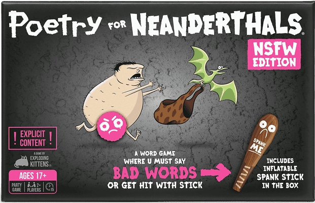 Poetry for Neanderthals: NSFW Edition is een uitbreiding op Poetry for Neanderthals. Poetry for Neanderthals: NSFW Edition is een Familiespel dat door 2-8 spelers gespeeld kan worden vanaf 17 jaar. Een spelletje Poetry for Neanderthals: NSFW Edition duurt gemiddeld 15 minuten . Poetry for Neanderthals: NSFW Edition staat in het Engels bekend onder de naam Poetry for Neanderthals: NSFW Edition. Poetry for Neanderthals: NSFW Edition is ontworpen door Elan Lee en wordt in het Engels in Nederland & België uitgegeven door Exploding Kittens. .