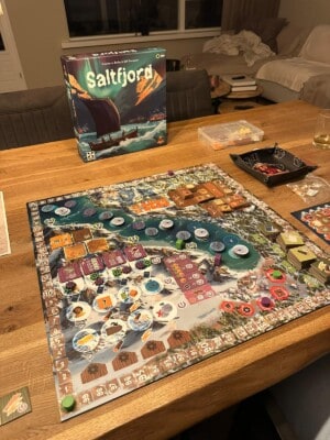 Maar ook zijn alle verschillende onderdelen van het spel, zoals het bouwen, het vissen of verhandelen, allemaal net zo waardevol. Hierdoor is er niet perse één mogelijke strategie. De herspeelbaarheid is hierdoor echt heel hoog. Het enige wat je misschien een beetje mist is interactie met anderen, maar dat is nou eenmaal een kenmerk van euro-games. Maar bij ons komt Saltfjord heel vaak op tafel!