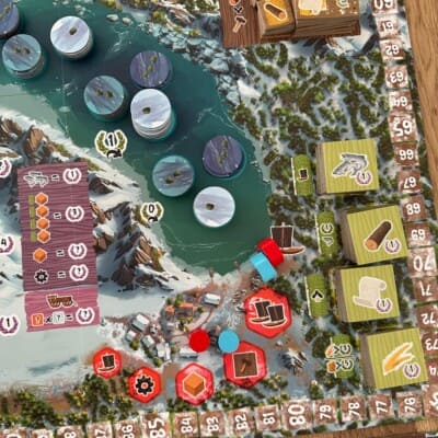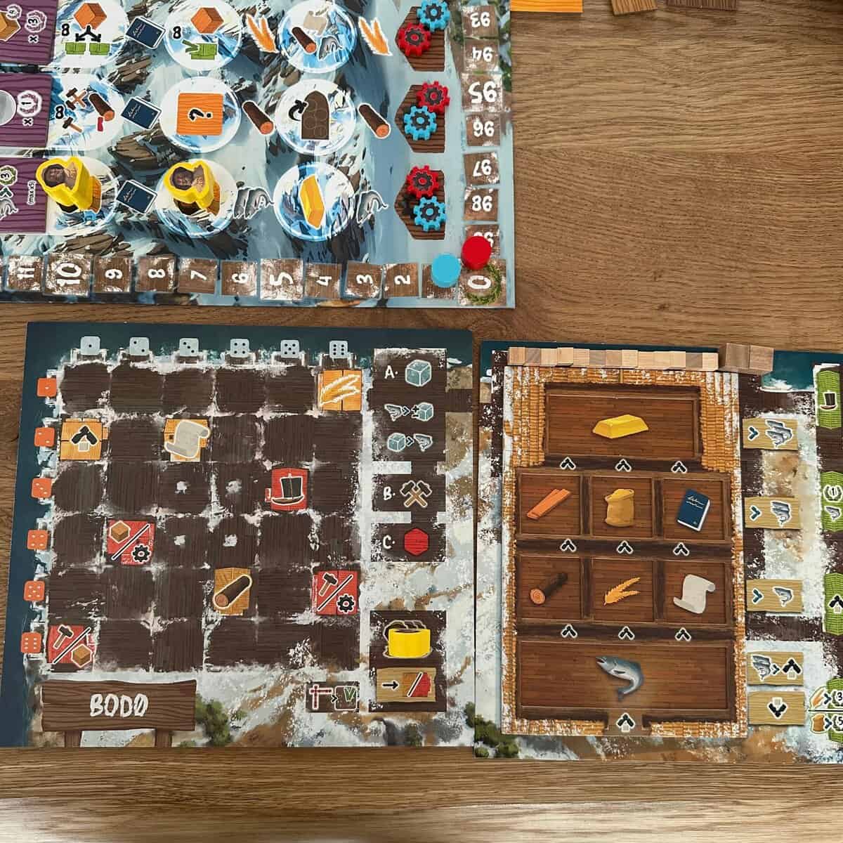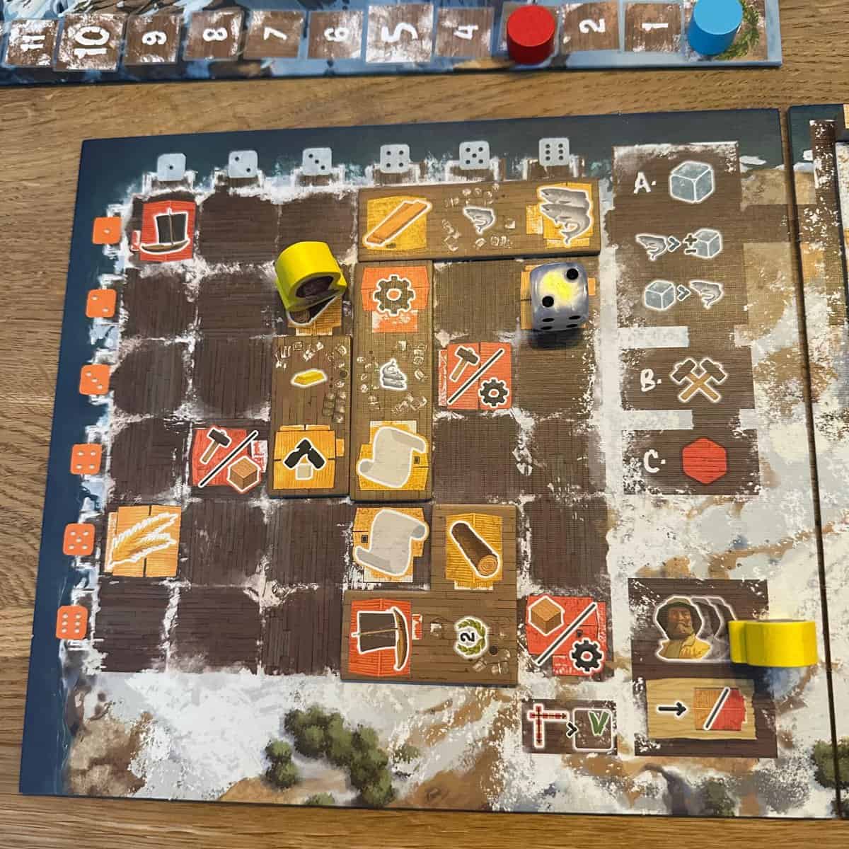 Zoals eerder aangegeven speel je met Saltfjord 3 rondes met elk potje verschillend aantal beurten. Dit komt natuurlijk omdat de ene speler meer bouwt dan de ander, of zijn/haar grondstoffen net anders gebruikt of dat je pech hebt met de beschikbare dobbelstenen.