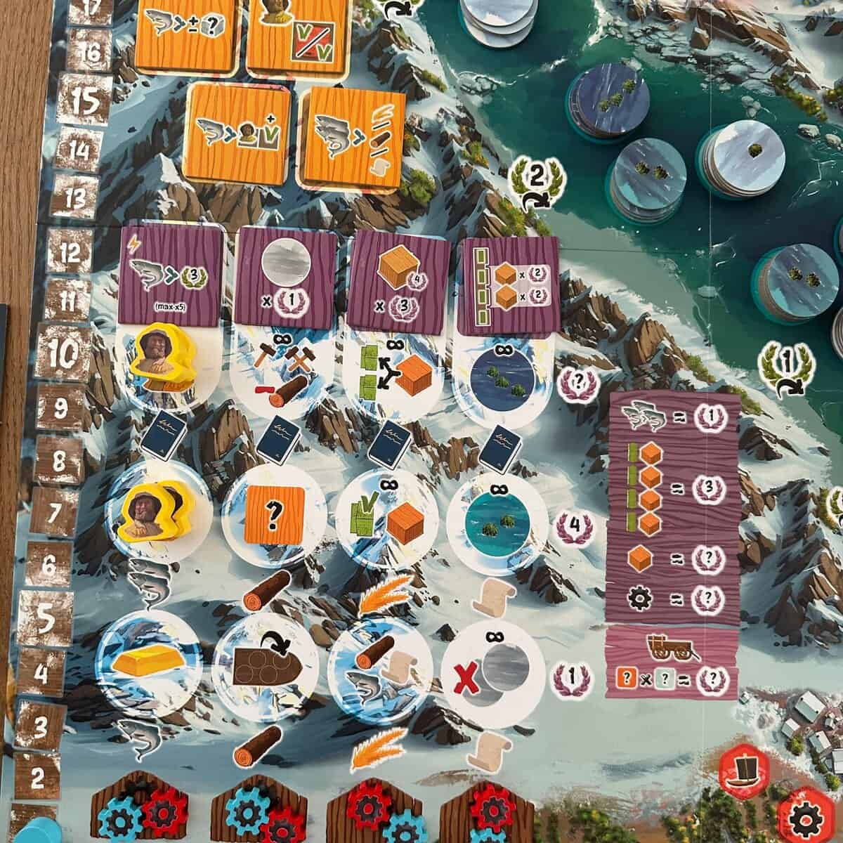 - En tot slot is het verbeteren van nieuwe technologie heel belangrijk in dit spel. Hierdoor worden onder andere hogere punten uitgedeeld aan het eind. Maar los hiervan krijg je ook sterke bonussen die allemaal goed te zien zijn op de symbolen op dit spoor. Bijvoorbeeld een extra werker, een extra plek op je bootje of minder betalen voor het bouwen van een gebouw.