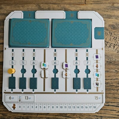 Wil je een kaart niet spelen, dan mag je hem ook verkopen. Je neemt dan niet de middelen die erop staan, maar je kiest of je 1 goud of 1 punt vooruit gaat op je tableau.